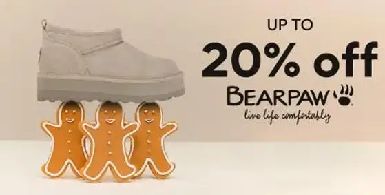 Hurry in & save! Shop in store and get up to 20% off BEARPAW.